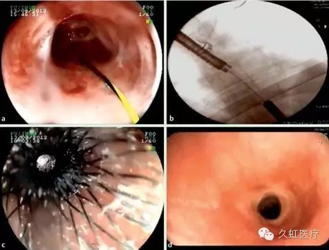 圖a.在遠(yuǎn)端內(nèi)鏡視野中見(jiàn)穿刺針通過(guò)食管梗阻部位;圖b.X線下見(jiàn)近端內(nèi)鏡和遠(yuǎn)端內(nèi)鏡經(jīng)導(dǎo)絲引導(dǎo)通過(guò)梗阻部位進(jìn)行對(duì)接;圖c.將全覆膜金屬支架(SEMS)置于梗阻部位,視野中可見(jiàn)逆行內(nèi)鏡的白光穿過(guò)支架;圖d.隨訪1年后,內(nèi)鏡下見(jiàn)梗阻完全治愈。