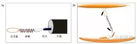 2009 年兩位日本學(xué)者 Sakamoto 和 Osada 以彈簧、金屬夾和尼龍圈為基礎(chǔ)設(shè)計(jì)出另一種體內(nèi)牽引技術(shù),并以兩人名字的首字母命名為 S-O 金屬夾牽引技術(shù)。該方法由金屬夾彈力圈聯(lián)合牽引法衍變而來(lái),以彈簧替代彈力圈,力求獲得更大的伸縮性,來(lái)適應(yīng)大的、表淺性的結(jié)腸早期腫瘤的 ESD 切除(圖 3)。