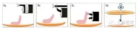 3. 另外一種更直接的方式是,把第二枚金屬夾與絲線同時(shí)固定于對(duì)側(cè)黏膜上,使剝離組織產(chǎn)生來(lái)自對(duì)側(cè)的張力,見(jiàn)圖 1c。但此種方法仍存不足,一是絲線本身只能提供定向拉力;二是絲線本身沒(méi)有收縮性,隨著剝離面的加大,絲線的張力會(huì)減小,其作用會(huì)隨之減弱或消失。