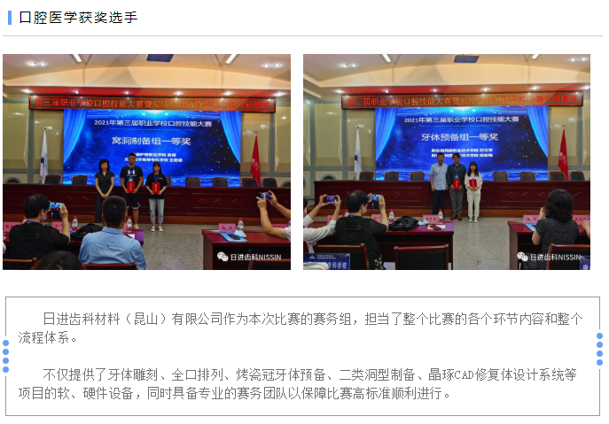 7月24日—25日,2021年京津冀口腔職業(yè)教育合作共同體“第三屆職業(yè)學(xué)校口腔技能大賽在唐山職業(yè)技術(shù)學(xué)院成功舉辦。大賽由京津冀口腔職業(yè)教育合作共同體主辦、唐山職業(yè)技術(shù)學(xué)院承辦、日進(jìn)齒科材料(昆山)有限公司協(xié)辦..