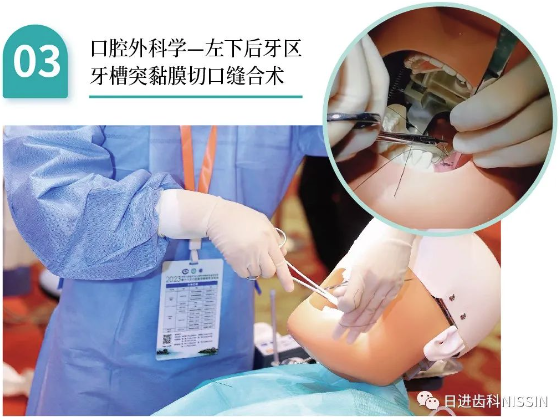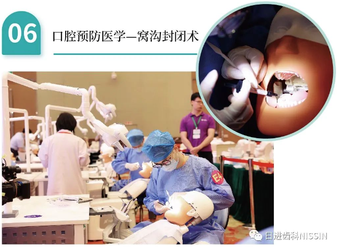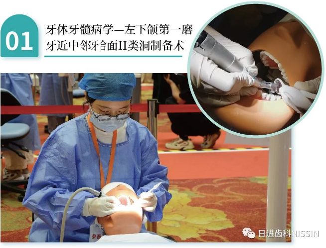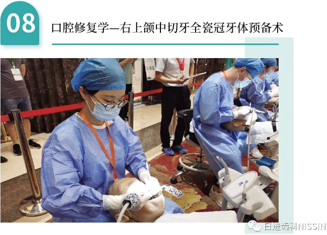 本次展示活動(dòng)共設(shè)十項(xiàng)技能操作展示,歷年最多單項(xiàng)。項(xiàng)目分別是牙體牙髓病學(xué)—左下頜第一磨牙近中鄰牙合面II類洞制備術(shù)、口腔修復(fù)學(xué)—右上頜中切牙全瓷冠牙體預(yù)備術(shù)、口腔外科學(xué)—左下后牙區(qū)牙槽突黏膜切口縫合術(shù)、牙周病學(xué)—齦上潔治術(shù)、急救醫(yī)學(xué)—單人心肺復(fù)蘇+AED急救技術(shù)、口腔外科學(xué)—牙拔除術(shù)、口腔外科學(xué)—口腔局部麻醉術(shù)、口腔預(yù)防醫(yī)學(xué)—窩溝封閉術(shù)、數(shù)字化口腔掃描技術(shù)、數(shù)字化臨床思辨。